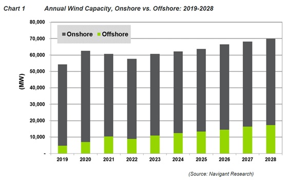 洋上風力を推進するための支援政策が実施されているため、洋上風力はこれらの課題に対してより断熱されています。 洋上風力は、商業規模の太陽電池に必要な大きなスペースを確保するのが難しく、費用がかかる大きな密集した沿岸人口センターに隣接して建設されます。 2019年から2028年までの洋上風力発電の10年間の予測は、15.4%の複合年間成長率(CAGR)と年間11,580 MWの10年平均で成長しています。 この10年間の平均は、2019年末までに予想される4,738 MWから始まり、2028年までに年間17,252 MWに達します。