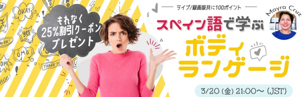 セミナー申込者にはもれなくMayra先生の"Conversación casual breve en español (No Feedback)"レッスンで使える25%割引クーポンをプレゼント