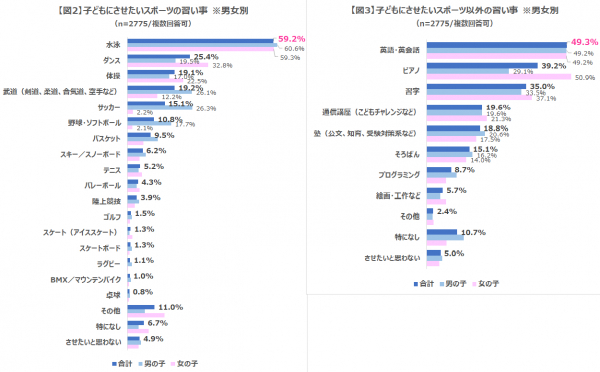 子どもにさせたいスポーツの習い事ランキングで1位は「水泳」59.2%、2位「ダンス」25.4%、3位「体操」19.1%という結果になりました(図2)。水泳は男の子・女の子共に1位でしたが、男の子の2位は「サッカー」・3位は「武道」、女の子の2位は「ダンス」・3位は「体操」と男女差がありました。