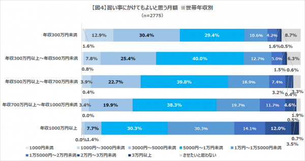 すでにしている習い事も含め、習い事にかけてもよいと思う月額を聞いたところ、「5000円~1万円未満」の回答割合が一番高くなりましたが、世帯年収ごとに見ると、世帯年収が高いほど習い事にかけてもよいと思う月額が高くなり比例する結果となりました(図4)。なお、地域別で見た際には、どのエリアでも一番多い割合は「月額5000円~1万円未満」でした。