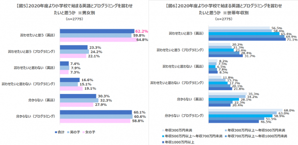 2020年度より小学校で始まる英語とプログラミングを、子どもに習わせたいと思うかどうかを尋ねたところ、「英語を習わせたいと思う」が62.2%だったのに対し、「プログラミングを習わせたいと思う」は23.3%と差がある結果となりました(図5)。男の子と女の子でもわずかながら差が出て、英語を習わせたいと思うのは女の子のママパパの割合が高く、プログラミングを習わせたいと思うのは男の子のママパパの割合が高くなりました。