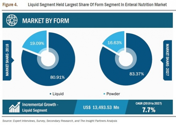 世界の経腸栄養市場は、その形態に基づいて、液体と粉末に区分されています。液体セグメントは、2018年に経腸栄養市場をリードしました。予測期間中も優位性を維持することが期待されています。