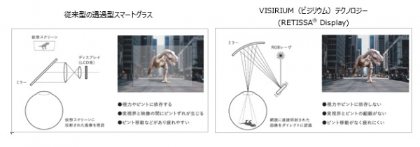 従来の透過型スマートグラス※は、仮想スクリーンに投影された映像を視認するため、視力やピントに依存します。また、実視界と映像の間にピントずれが生じやすく、眼の疲れの原因となるピント調節が頻繁に起こる等の問題点がありました。