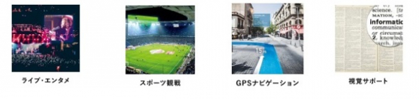 “AR体験”とは、Augmented reality(拡張現実)体験のことです。VRの様な全く異なる仮想現実に飛び込む(没入する)ものと異なり、現実に対してデジタル情報を付加します。例えば、視野にマニュアルを表示する“作業支援”、キャラクター等を現実世界に描く“エンタメ”といったさまざまなシーンで、新しいビジョンをお見せします。