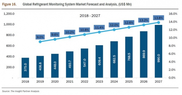The Insight Partnersによると、世界の冷媒監視システム市場は、2018年に3億7,500万米ドル規模に達し、2027年には9億9,000万米ドルに到達すると予想されています。予測期間中、同市場はCAGR11.7%で成長する見込みです。