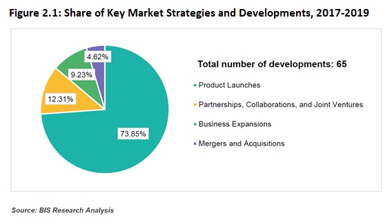 図は、2017年から2019年の期間中に市場のプレーヤーによって採用されたさまざまな戦略の割合を示しています。大多数の企業は、市場での競争力をさらに高めるための重要な戦略として製品の発売を好みました。企業はまた、収益を増やすだけでなく、地域のフットプリントを高めるために、事業拡大、パートナーシップコラボレーション、ジョイントベンチャー、および合併買収戦略を採用しました。