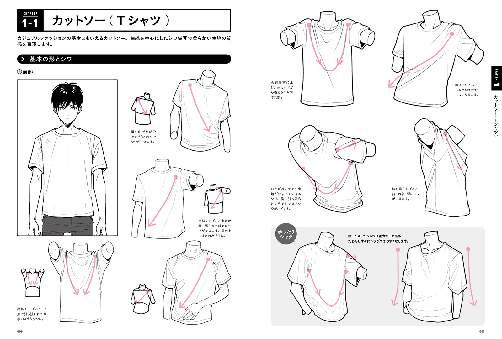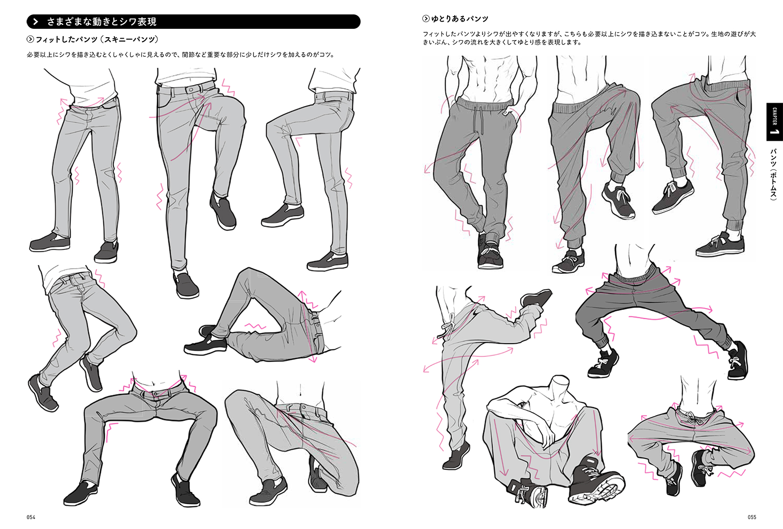 実際に服にできるシワを全部描くと、イラストではシワだらけに見えてしまうもの。本書では「このポーズではどこにシワができる」という法則をひとつひとつ解説。必要なシワだけを抜き出し、自然に見えるよう描くテクニックが身につきます。