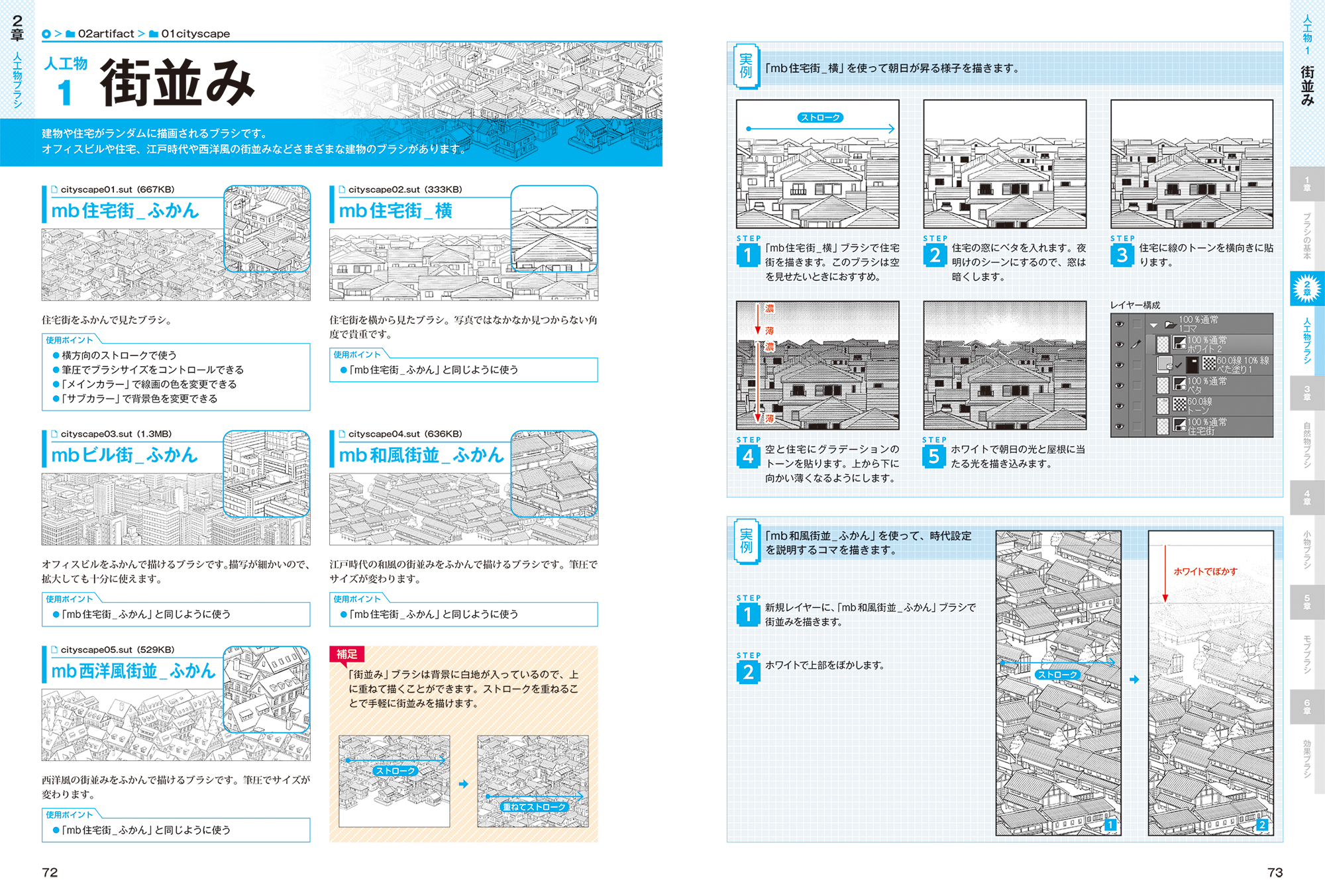 住宅街や繁華街などの街並みを手軽に作れる建築物ブラシ、キャラの後ろにさまざまな花や植物を散らせる自然物ブラシを多数収録。さらに通行人や学生などのモブキャラを配置できる人物ブラシ、ベタフラッシュやスピード線といったマンガならではの効果ブラシまで揃っています。