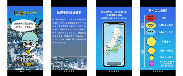 GPS機能を存分に発揮した地震予測アプリであり、現在地から半径100Kmの地震予測情報を得ること可能です。旅行・出張などで移動した際に、地震予測範囲に入るとプッシュ機能でお知らせが届くアクティブアプリです。