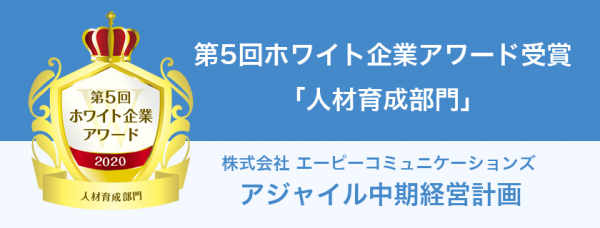 エーピーコミュニケーションズは、一般財団法人日本次世代企業普及機構(通称 ホワイト財団)が主催する「第5回ホワイト企業アワード」において、2020年3月17日に「人材育成」部門で受賞いたしました。