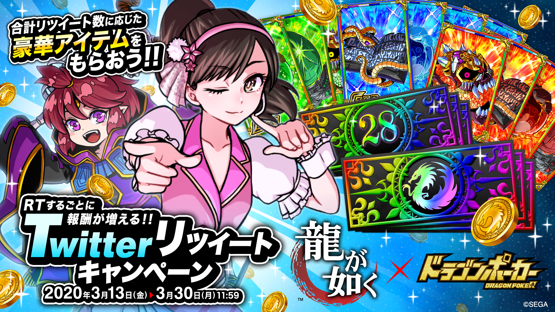 『龍が如く』とのコラボイベント開催決定を記念して、「Twitterリツイートキャンペーン」を開催いたします。期間中、『ドラゴンポーカー』公式Twitterアカウント(@DragonPoker_aso)が投稿した、各キャンペーン対象ツイートの合計リツイート数に応じて、ゲーム内で使用できるアイテムをユーザー全員にプレゼントいたします。