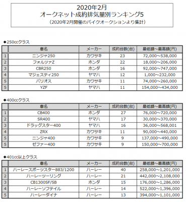 オークネット バイクオークション2020年2月成約排気量別ランキング