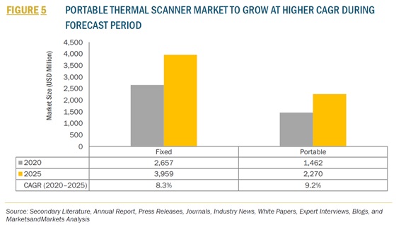 ポータブルサーマルスキャナーの市場は、予測期間中に9.2%の高いCAGRで成長すると推定されます。ポータブルで費用対効果の高いサーマルスキャナーとしてのスマートフォンの出現は、予測期間中にハンドヘルドサーマルスキャナーの市場を牽引すると予想されます。ハンドヘルドサーマルスキャナーは、機械的、電気的、建物の問題の診断に使用できます。これらのスキャナーにより、ユーザーはターゲット全体の正確な温度測定を記録し、隠れた問題を簡単かつ迅速に見つけることができます。固定サーマルスキャナーの市場は、その安定性、正確なキャリブレーション、および空港、重要なインフラストラクチャエリア、鉄道/バス停留所などのさまざまな場所に取り付けて使用できる柔軟性により、大幅に成長していると推定されています。