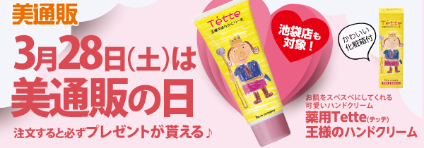 次回の「美通販の日」は2020年3月28日(土)。プレゼントアイテムは、「薬用Tette(テッテ) 王様のハンドクリーム」をご用意いたしました。日々のサロンワークで荒れがちな理美容師の手をやさしく守るハンドクリームを、当日お買い物された方全員にプレゼントいたします。また、「美通販の日」は、通販部同様、美通販池袋店でのお買い物もプレゼント対象となります。1点だけでも商品を注文・購入するだけで、素敵なプレゼントがもらえるおトクな日ですので、この機会にたくさんの方々にご利用いただければと考えております。