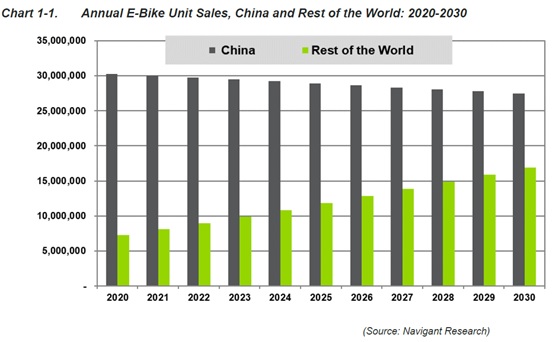 中国の過飽和状態の電動自転車市場を除くと、世界の電動自転車の販売台数は今後10年間で力強い成長を達成すると予想されており、販売台数は2020年の730万台からCAGR 8.8%で2030年までにほぼ1700万台に増加すると予測されています。