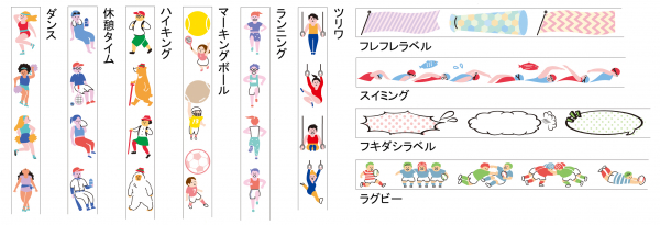 今回登場する「SPORTS!」柄は、運動・スポーツをモチーフに、毎日の記録やデコレーションに使える、カラフルでユニークな柄をラインアップしました。「ラグビー」「ランニング」をはじめ、お出かけの日のマークにも使える「ハイキング」、手帳の罫線に座っているような立体表現も楽しめる「休憩タイム」、サッカーやゴルフのボールで日付をマークできる「マーキングボール」など遊び心満載。表情豊かな手帳づくりが楽しめる全10種類です。メーカー希望小売価格(税抜)は各280円です。