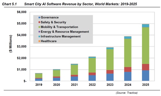 Tracticaは世界のスマートシティAIソフトウェアの収益は、2019年の6億7,380万ドルから2025年までに年間約50億ドルに達すると予測しています。モビリティおよび輸送ソリューションは、2025年の年間収益32億ドルを占めるスペースの収益の大部分を占めると予測されています。このカテゴリには、自動運転タクシー、ライドシェアリング、シャトルサービス、およびスケジューリング、メンテナンス、運用に使用されるプラットフォームが含まれます。このカテゴリの他のユースケースには、交通制御および管理ソリューション、スマートパーキング管理アプリケーション、街路照明、およびビデオ監視技術が含まれます。