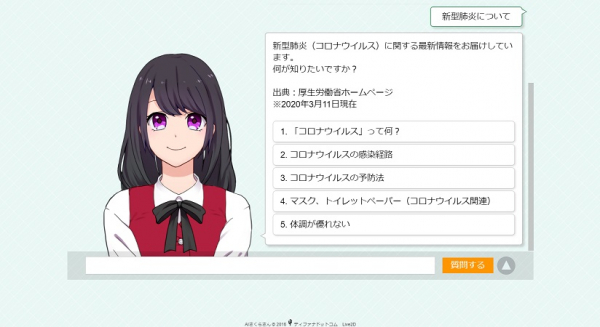 これにより、厚生労働省発表の「新型コロナウイルスに関するQ&A」に準拠した会話が可能になり、新型コロナウィルスに関する最新情報をサイネージ、パソコンなどのデバイスを通じて、24時間いつでも迅速な回答が可能なため、問い合わせ対応の負担軽減が期待されます。尚、既に稼働中のさくらさんには新型コロナウイルスの最新情報提供を順次適用していく予定です。