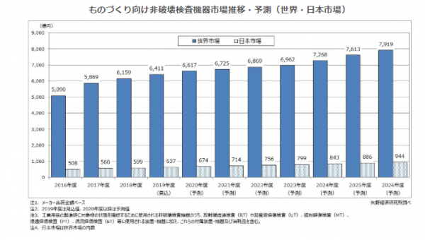 株式会社矢野経済研究所(代表取締役社長:水越孝)は、2019年度のものづくり向け非破壊検査機器世界市場を調査し、産業分野別動向、検査種類別動向、将来展望を明らかにいたしました。