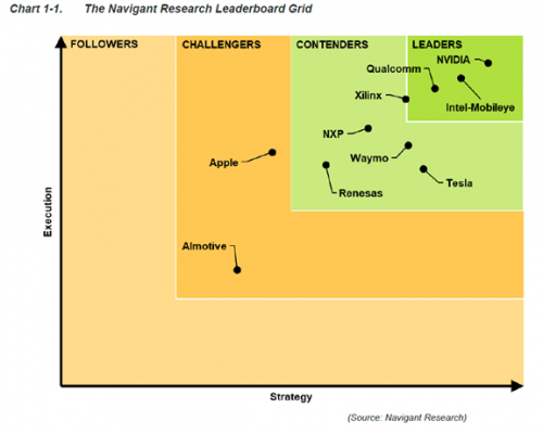 図1-1は、各企業のスコアを示しています。このリーダーボードでは、3社がNVIDIA、Intel-Mobileye、およびQualcomm Technologiesのリーダースコアを獲得しました。 AD開発に携わる企業のほとんどは、NVIDIAまたはIntelのチップを使用しています。場合によっては、両方のザイリンクスフィールドプログラマブルゲートアレイ(FPGA)も使用しています。 Qualcommは、高性能の自動車用コンピューティングセクターにとって比較的新しいものですが、そのチップが期待どおりに機能する場合、同社は大きな市場シェアを獲得する可能性があります。これらの各企業は、自動車グレードのシリコンの大量生産の経験があり、さまざまな用途向けの大量生産車両にチップを持っています。競合他社の中では、NXP SemiconductorsとRenesas Electronics Corporationも主要な自動車ベンダーであり、Waymo LLC、Apple Inc.、およびAImotiveはすべてこの業界の新参者です。テスラは自動車メーカーとしての地位を確立していますが、プロセッサの開発は初めてです。