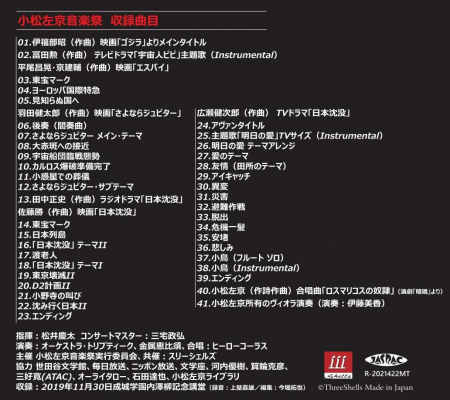 小松左京が作詩・作曲した男声合唱曲「ロスマリコスの奴隷」と小松左京が実際に演奏していた「ヴィオラ」(オリジナル楽器)を使って演奏した小松左京お気に入りの曲「炭坑節」です。原作による音楽だけでなく、実際に作詩・作曲、所有楽器までを収録したのは 「小松左京」の名前を冠した音楽祭としてこれ以上のものはないこだわりでしょう!