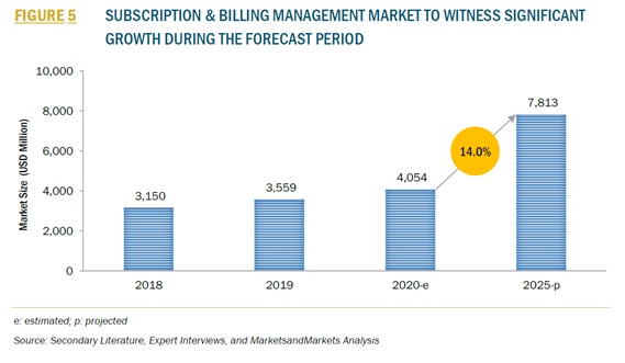 上の図は、予測期間中のグローバルなサブスクリプションおよび課金管理ソフトウェア市場を示しています。 市場は、2020年の40億5400万米ドルから2025年までに78億1300万米ドルに成長すると予測されており、予測期間中のCAGRは14%です。 この成長を促進する主な要因は、サブスクリプションビジネスモデルの採用の増加、加入者の解約と顧客維持率の改善に対する需要の増加、コンプライアンス遵守の必要性の高まりです。