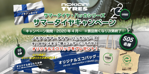 キャンペーン期間中に、ノキアンサマータイヤ1台分(4本)をご購入のエンドユーザーの方、先着505名様にもれなくオリジナルエコバッグをプレゼントいたします。