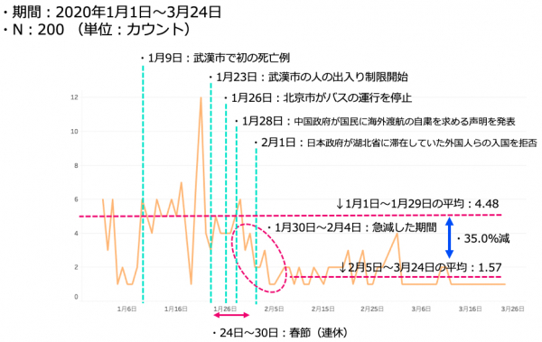 毎年、春節の連休には多くの中国人が日本を訪れますが、今年は中国の春節の期間(1月24日~1月30日)に突出したピークは認められませんでした。しかしながら減少自体は認められないため、春節には一定数の中国人は訪日していたと推測されます。1月28日に中国政府による海外渡航の自粛の声明が発表されましたが、その直後の1月30日から2月4日に掛けて急激な減少が認められ、その後は低調に推移していることが分かります。急激な減少の前と、後では約35.0%の減少となりました。