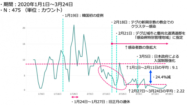 韓国でも春節(旧正月)は連休でしたが、中国人とは異なり、その期間に明瞭なピークが存在しています。韓国では1月19日に初の症例が確認されましたが、その後しばらくの間大きなクラスター感染がなかったため、大きなぶれはありませんでしたが、2月18日にテグにある新興宗教の教会での大規模感染が確認された数日前から急激な減少傾向が認められ、その後は低調に推移していることが分かります。急激な減少の前と、後では約24.4%の減少となりました。なお、3月5日から日本政府による入国制限強化がスタートしましたが、それ以前から低調となっていました。