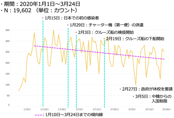 中国人と韓国人ではどちらも「急減の期間」が認められましたが、日本人には急減は認められず、3月24日までは緩やかな減少となっています。調査地点は西新宿のビジネスエリアですが、リモートワークの実施は3月24日までの時点では限定的と言えるのかも知れません。