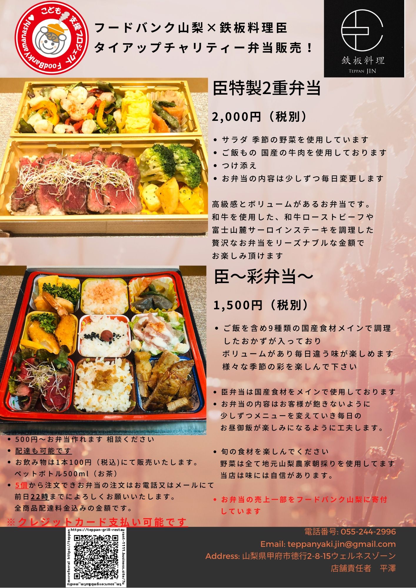 この度、16francs株式会社が運営する鉄板料理 臣 により、緊急食料支援の活動費への支援としてチャリティー弁当を販売することになりました。今回の弁当は過熱式の新商品となっており、この弁当の売り上げ金の一部をフードバンク山梨へご寄付させて頂きます。このご寄付は、今回の新型コロナウイルスに係る食料支援の費用の一部に活用をさせて頂きます。この企画は新型コロナウイルス終息後も継続的に実施していただけることになっており、さらに多くのご家庭の支援を実施していく予定です。