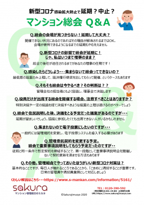 そこで、業界初の個人向け総合不動産コンサルティング・ホームインスペクション(住宅診断)、マンション管理組合向けコンサルティングを行う “不動産の達人 株式会社さくら事務所”(東京都渋谷区/社長:大西倫加)では、新型コロナの影響を受け、総会実施の可否や注意点についてマンション管理士が答えるQ&Aリストを作成、27日(金)より無償配布いたしました。