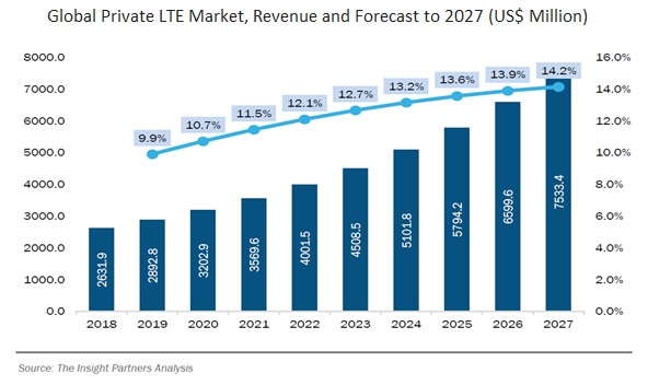 The Insight Partnersによると、世界のプライベートLTE市場は、2019年から2027年に12.7%のCAGRで成長し、2027年には75億米ドルに達すると推定されています。
