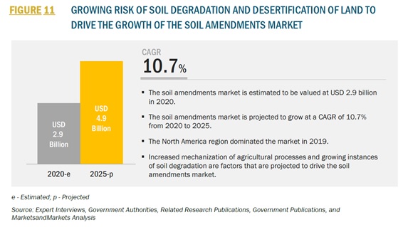 土壌改良剤市場の成長は、関連する利点、持続可能な農業の必要性の増加、および合成肥料と従来の肥料の開発と浪費の減少によりペースを上げています。有機性土壌改良剤の高い採用と土壌の健康を維持する必要性のために、北米が土壌改良剤市場を支配し、ヨーロッパがそれに続きました。土壌改良材の使用は、主に果物や野菜、穀物、穀物が続きます。