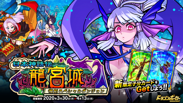 株式会社アソビズム(本社:東京都千代田区、代表取締役:大手智之)は、App Store・Google Playにて好評配信中のリアルタイム合体カードバトル『ドラゴンポーカー』で、2020年3月30日(月)より復刻スペシャルダンジョン「日本神話伝 龍宮城」を開催いたします。