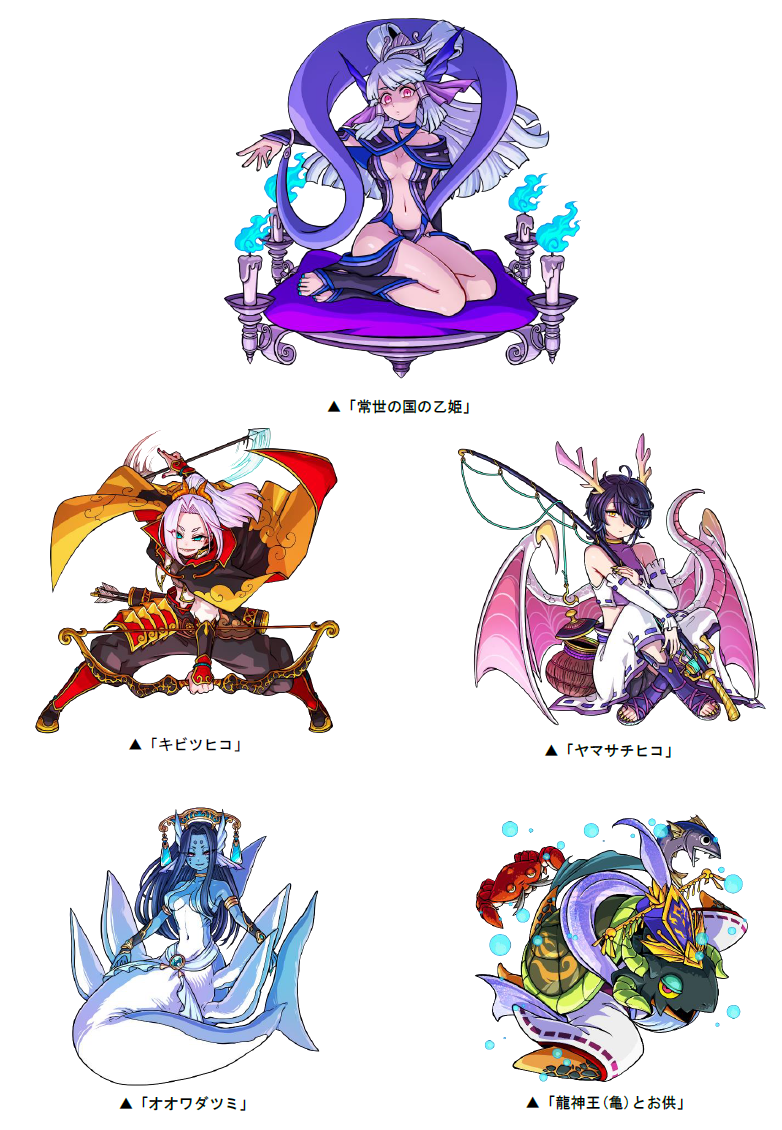 また、道中には「キビツヒコ」「ヤマサチヒコ」「オオワダツミ」「龍神王(亀)とお供」などが出現し、クリアした際に手に入る「龍宮P」を貯めると、DRAレア「龍神王(亀)とお供」やSS+レア「龍神王」「蟹和尚」「大鯖」と交換することができます。