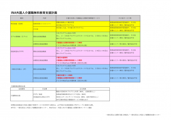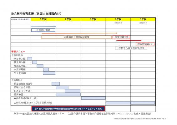 なお、EPA介護福祉士候補者、介護技能実習生及び一般外国人介護職の方々も、在籍事業所がINAの賛助会員(月会費2万円、技能実習監理組合の紹介先は1万円)であれば、特定技能介護職向けに無料提供される特定技能介護職向け5か年教育支援プログラムのすべてを受講できます。また、賛助会員事業所には職場研修にも利用できる指導教材コンテンツ一式を貸与することになっています。