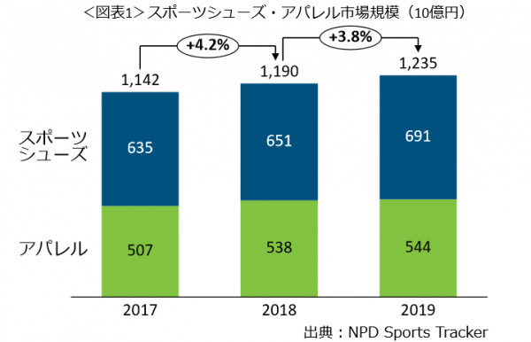 スポーツシューズ・アパレル市場規模は、2019年1.2兆円で3.8%増