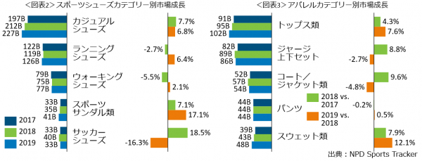 日本におけるスポーツシューズ・アパレル市場規模は、2019年1月~12月計に約1.2兆円で、前年同期比3.8%増加しました(図表1)。成長をけん引したのはスポーツシューズで、前年比6.1%増の6908億円でした。