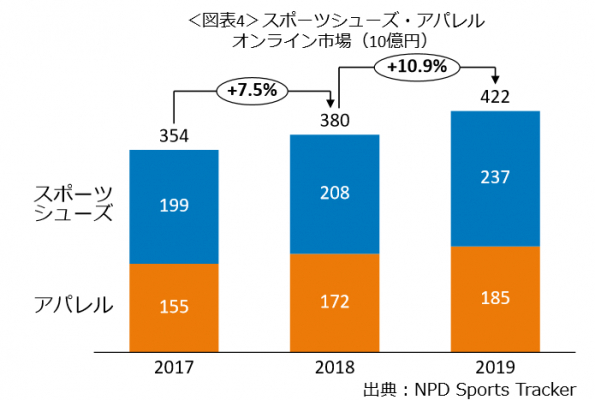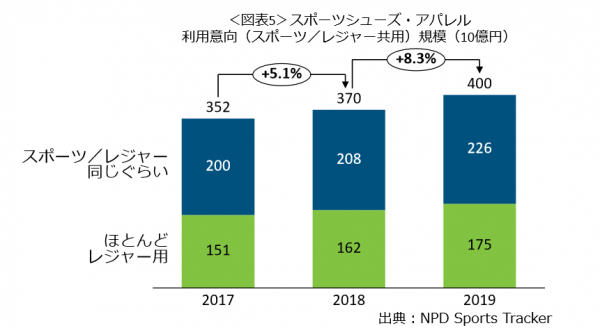 購入チャネルをみると(図表4)、市場規模の約3割を占めるオンラインチャネルが成長の主要因となっていることが分かりました。2019年のスポーツシューズ・アパレル市場におけるオンラインチャネルでの購入は、4219億円(スポーツシューズ:2371億円、アパレル:1848億円)で前年比10.9%増でした。昨今のコロナウィルスによる外出を通常よりも控えざるを得ないような消費行動への影響を考慮すると、インターネット上での購買がこれまで以上に増え、オンライン販売の重要性は、ことスポーツシューズ・アパレル市場においても、ますます増してくることが考えられます。