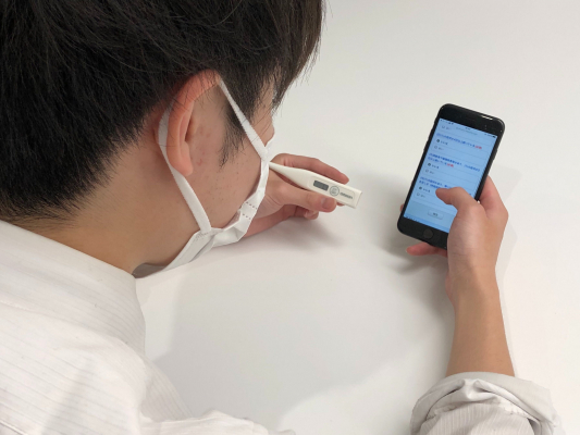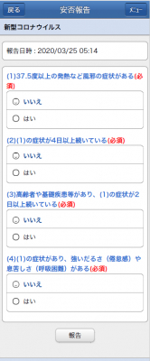 日頃利用している安否確認サービスに新型コロナウイルス対策が追加されたことを受け、3月4日(水)よりアンケートを実施。「37.5度以上の発熱など風邪の症状がある」など4つの質問項目を毎朝報告。「はい」にチェックがついた場合は出勤しないことを徹底します。