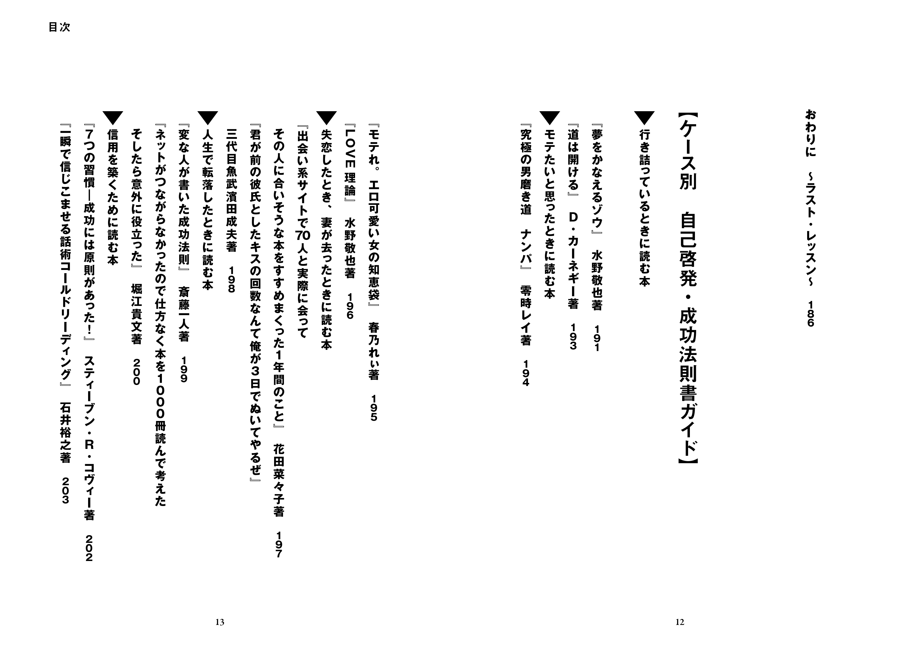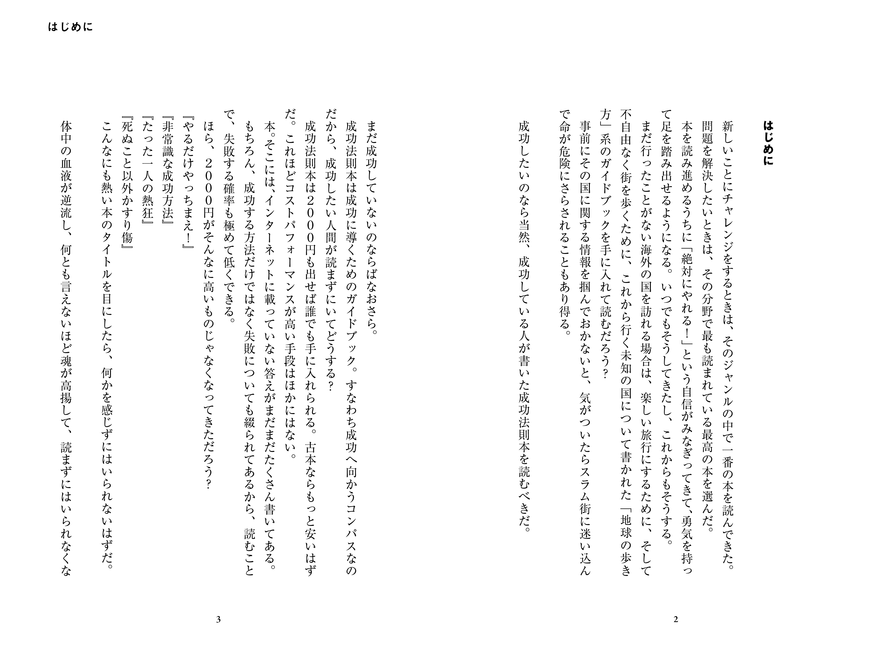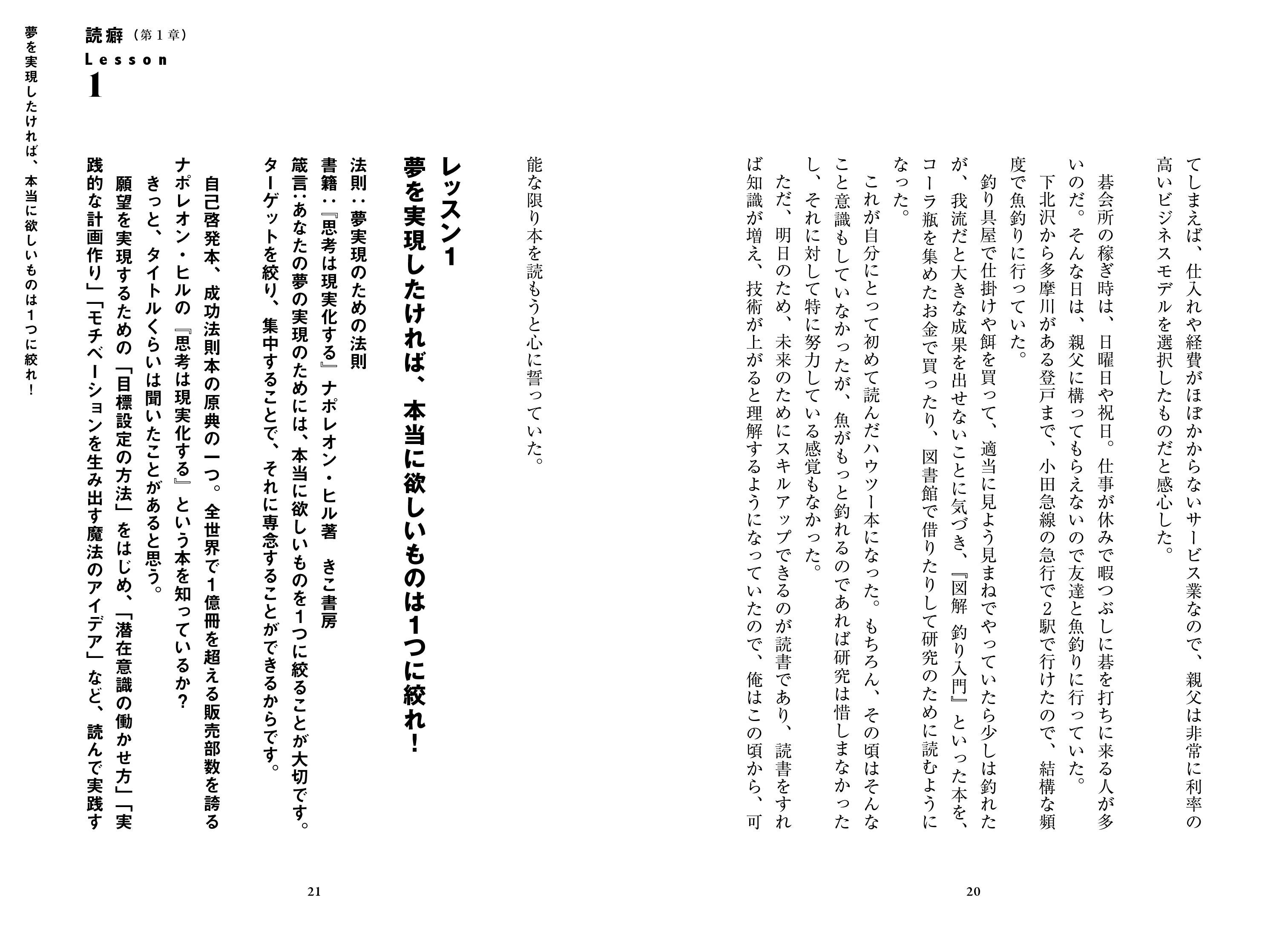 「失敗したところでやめてしまうから失敗になる。成功することころまで続ければ、それは成功になる」(「松下幸之助 発言集」) 本書は、プロミュージシャンを目指した著者の挫折と起業のエピソード、そしてその人生のさまざまな局面で出合った書籍を二元的に紹介した内容になっています。著者は、この本の中でなんどか登場する言葉「やってやってやりまくる」のとおり、成功法則本や自己啓発本から読み取った箴言を徹底して実行した結果、ビジネスチャンスのきっかけをつかむ。失敗の中で実践した経験を基に書いた書籍紹介は、いま厳しい状況にある読者に一筋の光を投げかけます。
