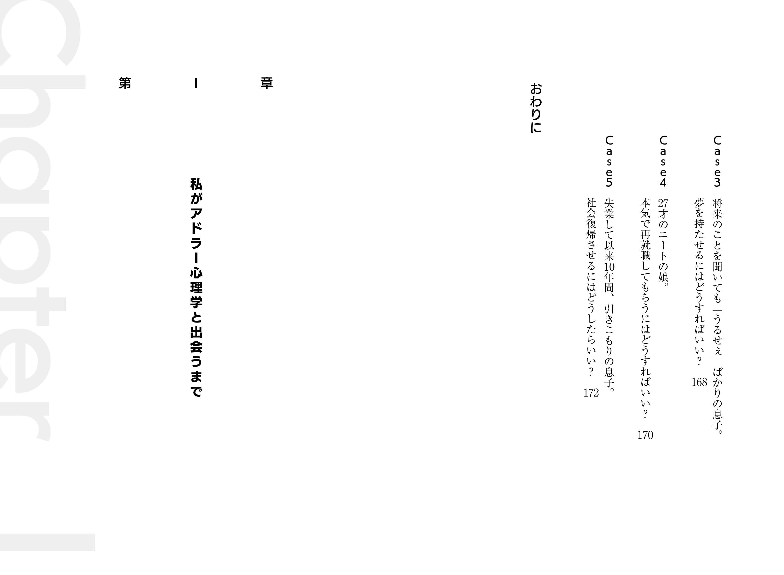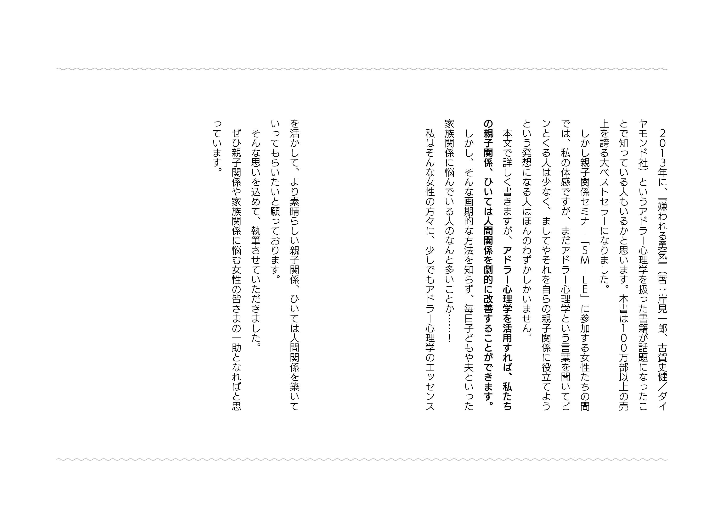 著者は、十代で妊娠、結婚、離婚、再婚、シングルマザーを経験しながら「生きているという実感」を求め、職を転々とし、生涯のライフワークとなる“アドラー心理学”に出会います。アドラー心理学には「悩みを軽くするコツ」がたくさんあり、著者はそれを用いて3,000人以上にカウンセリングを行ってきました。本書では、親子関係や夫婦関係に悩む10人の女性たちがアドラー心理学を通じて、悩みを解決していく様子が描かれています。読者の皆さんも、本書を通じて、親子関係や夫婦関係の悩みを解消してください。