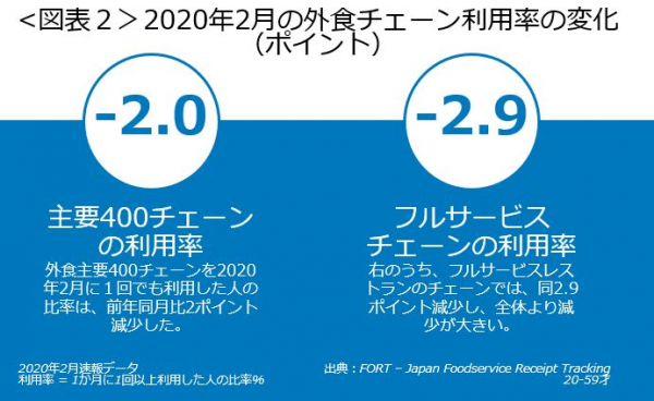 主要外食約400チェーンの利用率(2月に1回以上利用した人の比率)は前年同月比で2ポイント減少しました。特にフルサービスチェーンの利用率の減少が大きく、同2.9ポイント減となりました。