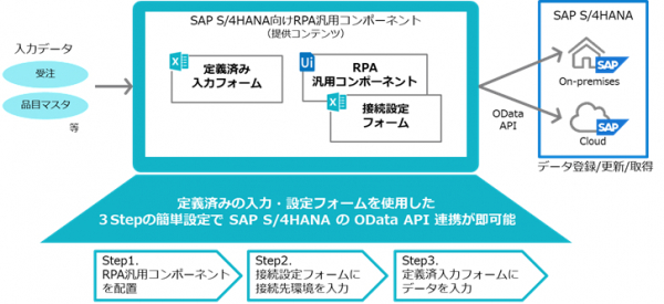 オープン技術「OData※3 API」を採用し、「S/4HANA」と「UiPath」のデータ連携部分をパッケージングすることで、RPAの開発技術や「S/4HANA」に関する専門知識等を必要としない業務の自動化を実現しました。また、「OData API」の採用により「S/4HANA」のオンプレミス環境に加えてクラウド環境にも対応し、アップグレード時のRPAの動作確認/改修も不要となります。