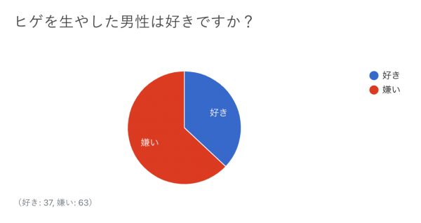 「ヒゲを生やした男性は好きですか?」の質問では、好きが37%、嫌いが63%という結果となりました。
