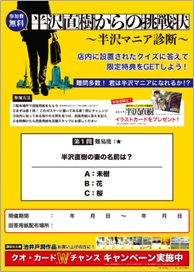 作品の世界観を楽しめる読者参加型のプロモーション。書店内に設置されたクイズに答えて回答用紙を完成させると、その場で「コミック 半沢直樹」(フジモトシゲキ 画、池井戸潤 原作、津覇圭一 構成/講談社「週刊モーニング」連載中)のイラストカードをプレゼント。