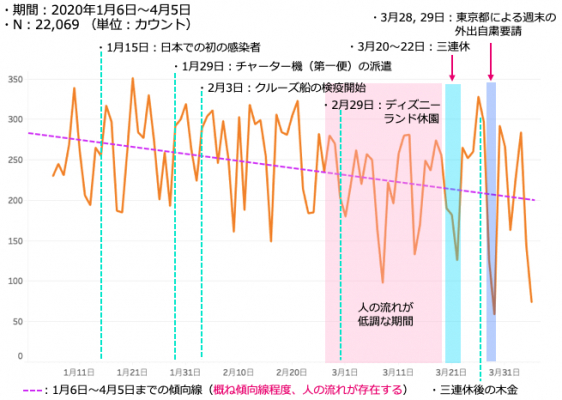 1月6日から4月5日までの、訪日外国人を除いた日本人の傾向を見てみると、全体としては強い減少傾向にあることが分かります。特に2月末あたりから3月の三連休程度までは低調に推移していましたが、三連休を境にして人の流れが増加に転じました。3月28、29日の東京都による週末の外出自粛要請時には、それに呼応する形で急減していたことが分かります。