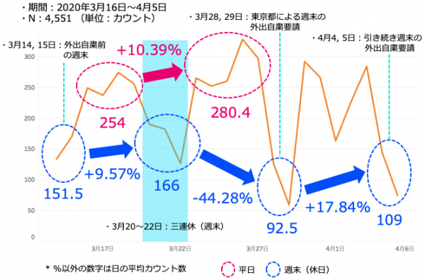 また、三連休の次の週末は、東京都による外出の自粛要請があり、それに呼応して、三連休よりも44.28%の減少となっていました。しかしながら、その次の週末では、外出の自粛要請が引き続きなされたにもかかわらず、前週対比で17.84%の大幅な増加となっていました。つまり、いわゆる”気の緩み”は三連休だけではなく、4月4日, 5日の週末にも現れていました。