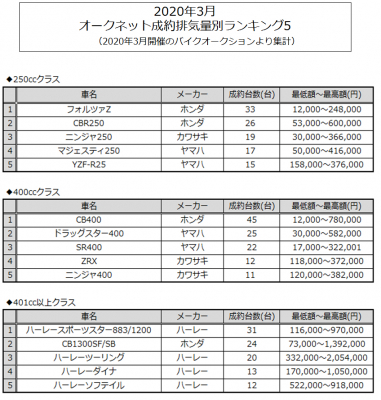情報流通支援サービスの株式会社オークネット(本社:東京都港区/社長:藤崎清孝)は、2020年3月度のオークネットバイクオークションにおける成約台数を集計し、排気量別ランキングベスト5をまとめました。